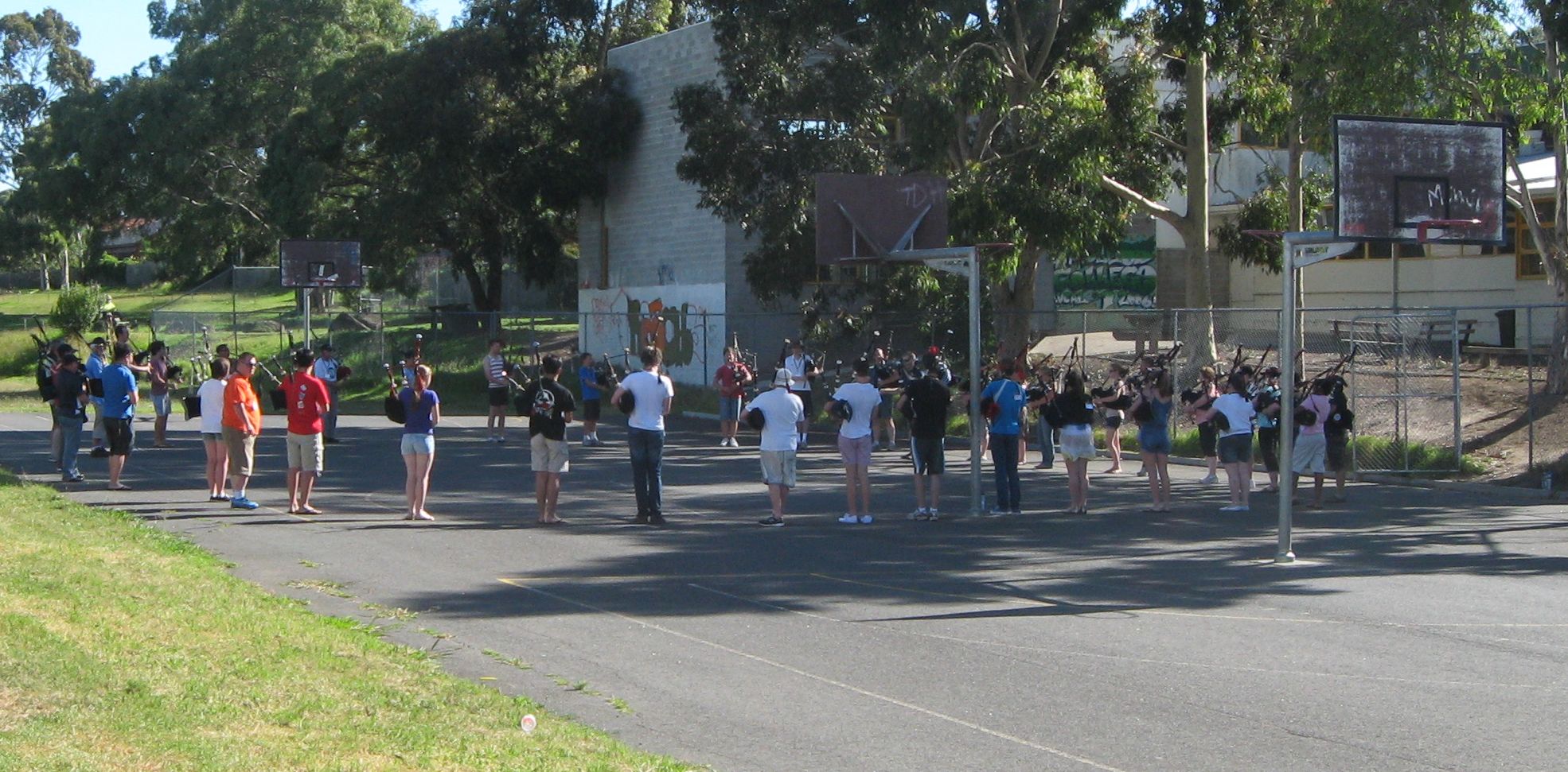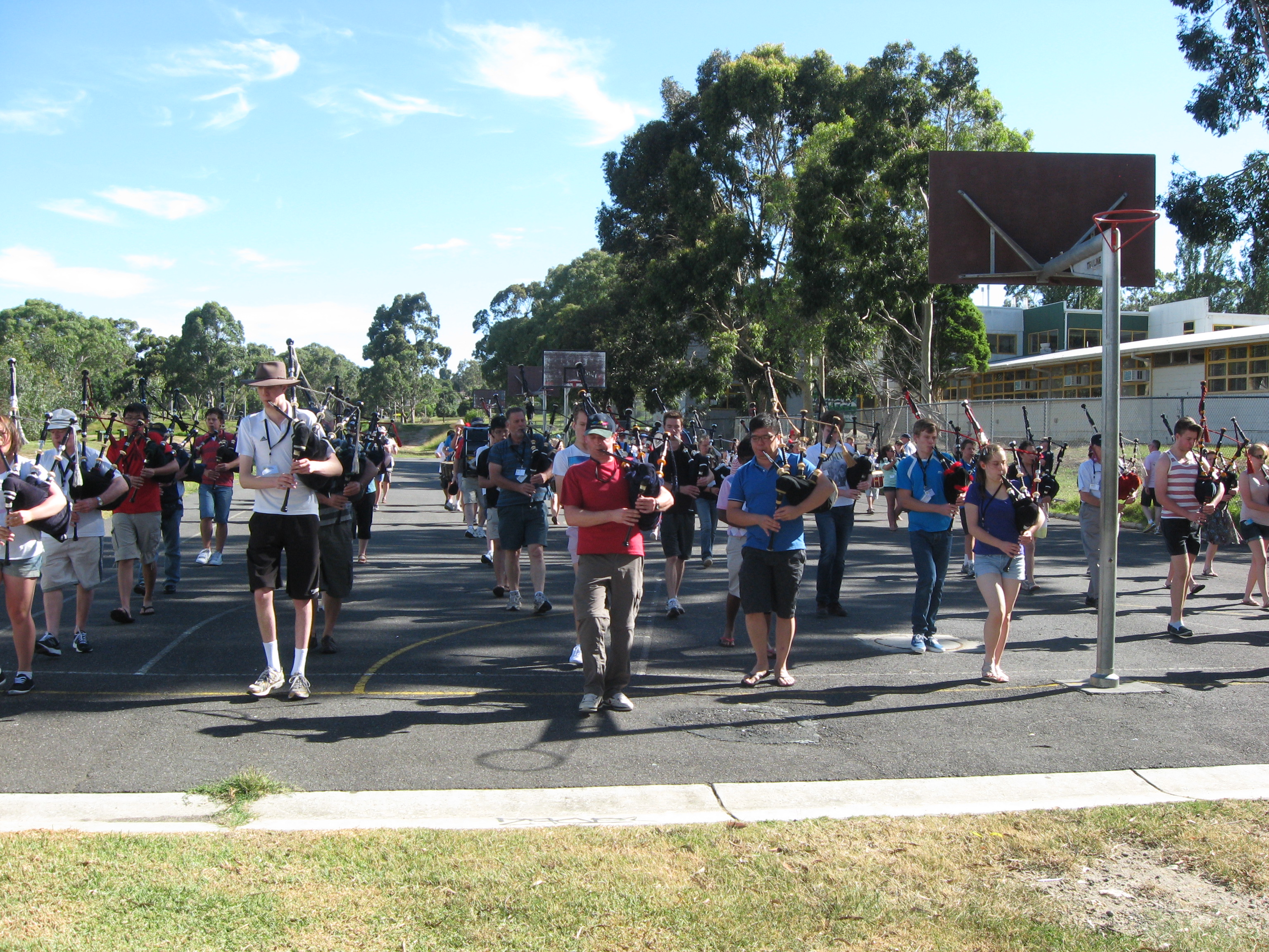 But what was that rattle of the drums this morning?- and the pipes- lots of them! There they were on the basketball court at the local high school at 9.30 on a hot Tuesday morning
