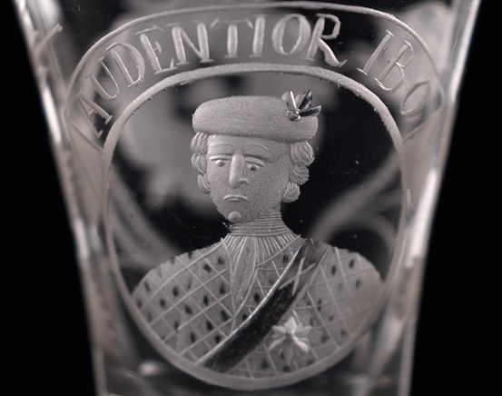 Seventy years- my, that puts the Coalition’s snit at not forming government after the 2010 election into the shade. It was dangerous to publicly avow loyalty to the Stuarts, and so Jacobite (the latinized form of ‘James’) sympathizers formed into clubs where they would toast loyalty over a bowl of water- thus toasting The King Over the Water (i.e. in French exile). The heavily engraved glassware they used in these toasts was decorated with etched symbols, and while at first glance the glasses seem similar to other glassware in vogue at the time, they were an act of fragile subversion.