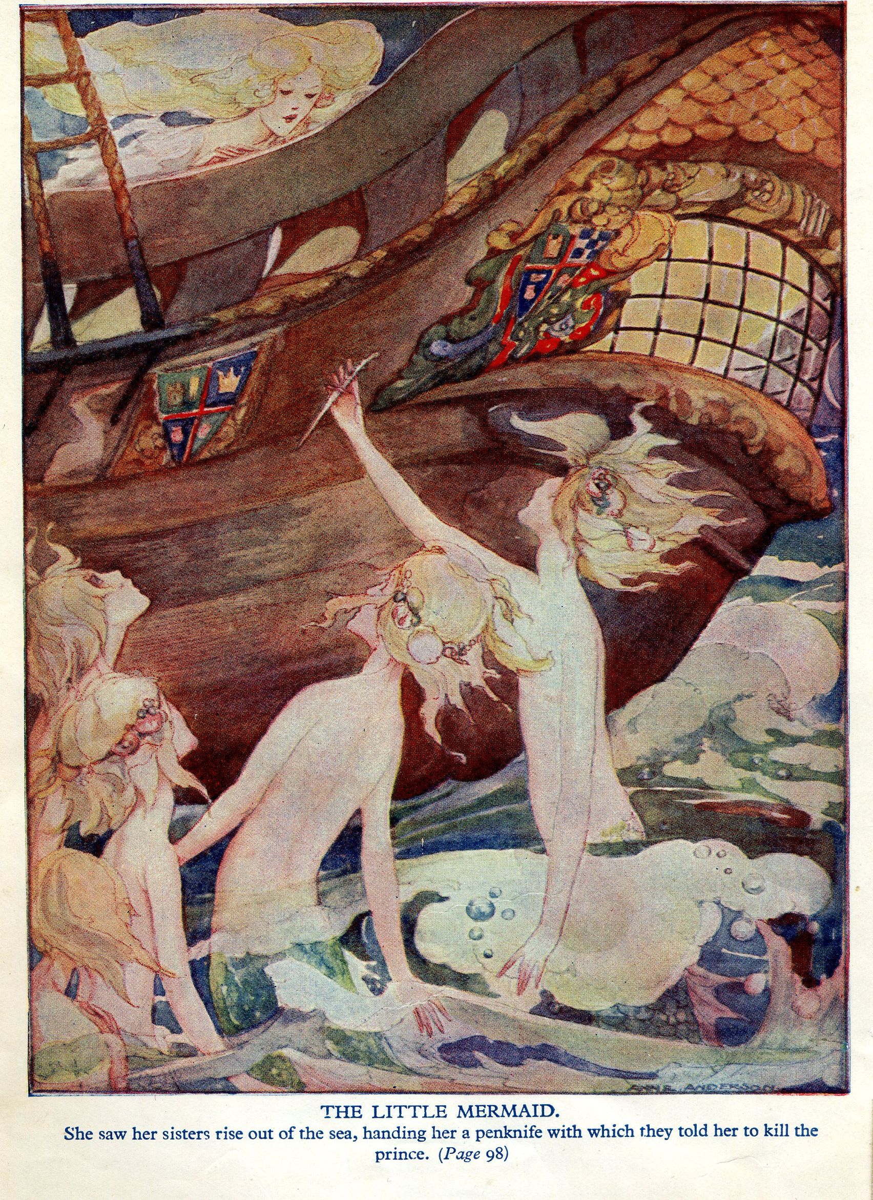 I’ve always loved stories about mermaids and selkies. As a child, it was a special treat for me to read a book that had belonged to my mother called “The Children’s Treasure House” by Alfred Noyes, copyright 1935. It has beautifully rendered coloured plates, black and white art-deco line drawings and it is indeed a treasury of stories and poems including Hans Christian Anderson, The Brothers Grimm and simplified retellings from the works of Charles Dickens, Victor Hugo, Shakespeare etc. I see through Trove http://trove.nla.gov.au/ndp/del/article/47810432b that it cost 5/- with 1/- for postage, and was available through the Women’s Weekly. I had two favourite stories in the book. One was the Snow Queen, and the other was The Little Mermaid- the REAL Little Mermaid: no Disney-saccharine Ariel, Flounder and Scuttle the Seagull here- but the proper story, with its pain, yearning and sad, sad ending.