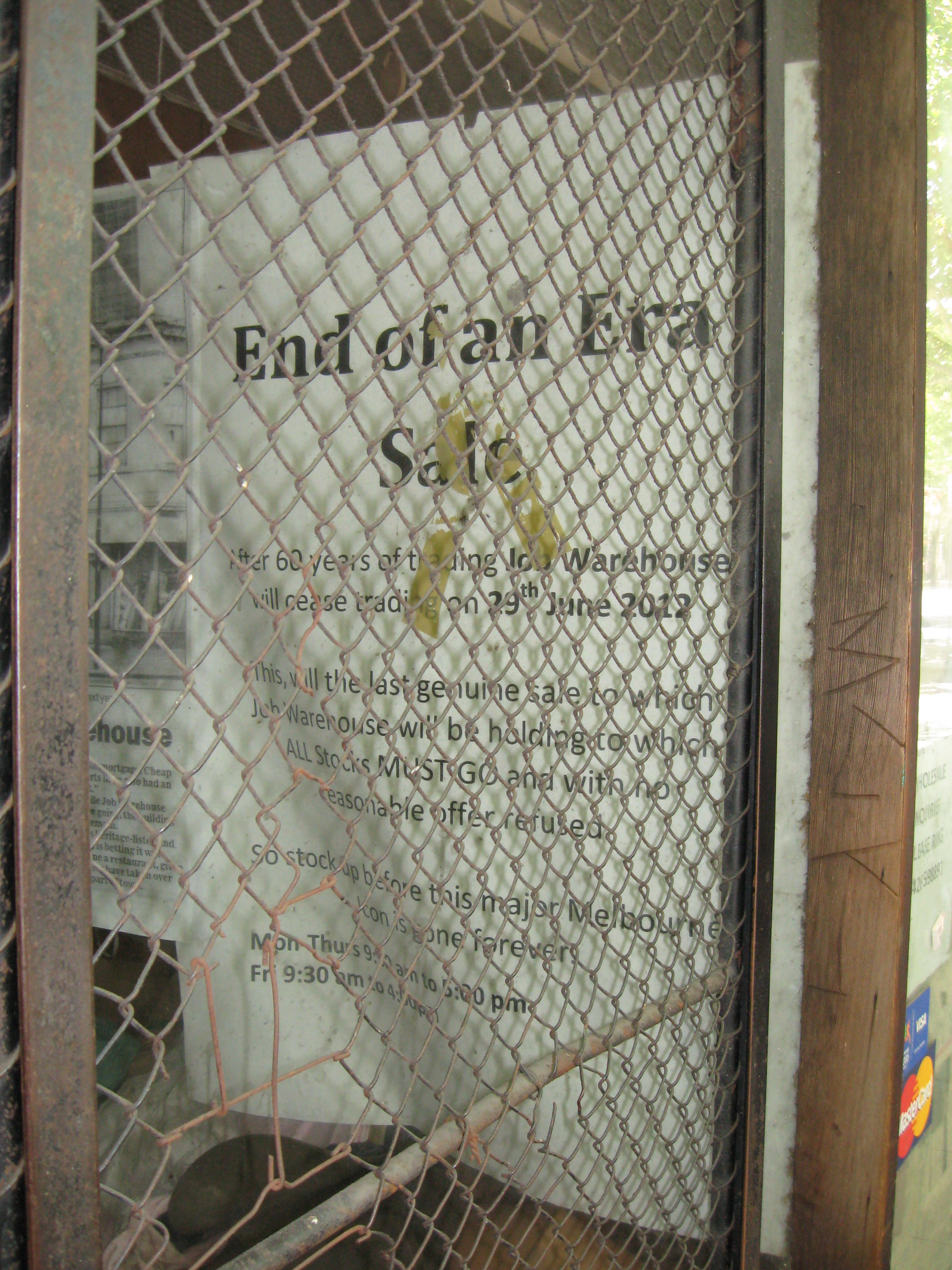 I must confess that I never stepped foot inside Job Warehouse while it was open. Two reasons: first, it was very rarely open and second, I’d heard terrifying tales about the owners. They were two brothers, Jacob and Max Zeimer, who arrived in Melbourne in 1948 as penniless Polish refugees. All their family had perished in the Holocaust. Their salesmanship was idiosyncratic: