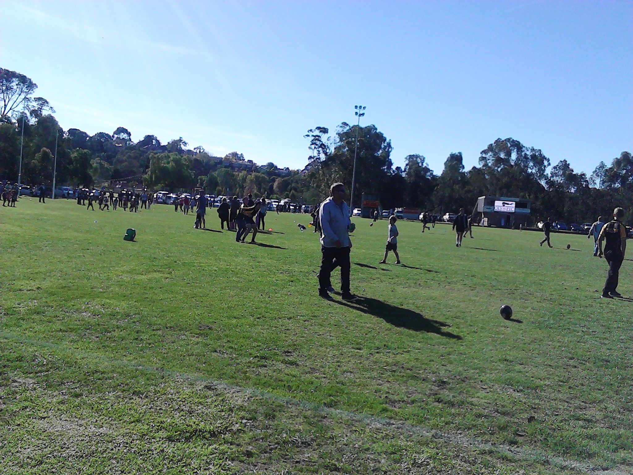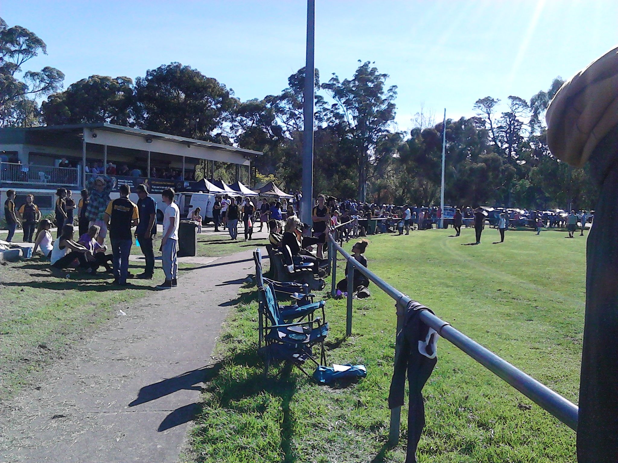 Real footy.  Where at half time and three quarter time everyone streams onto the ground to have a bit of kick-to-kick or to crowd around to hear what the coach has to say.  Where the little league kids form a line and clap the team back onto the ground after half-time, before they go up to get a sausage and a drink, “only after yer tell Mum and Dad where y’are!”  Where the winning tickets for the slab of beer and the meat tray are displayed on the scoreboard, and the winner can pick them up at the bar. Where kids ride their bikes around the outside of the oval, where dogs are tethered on leads attached to the fence, where you can get a snag in bread for $2.50 and a VB that doesn’t come in a plastic cup.
