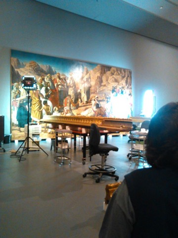 Conservation work currently being conducted in public view on the Moses painting, second floor NGV.