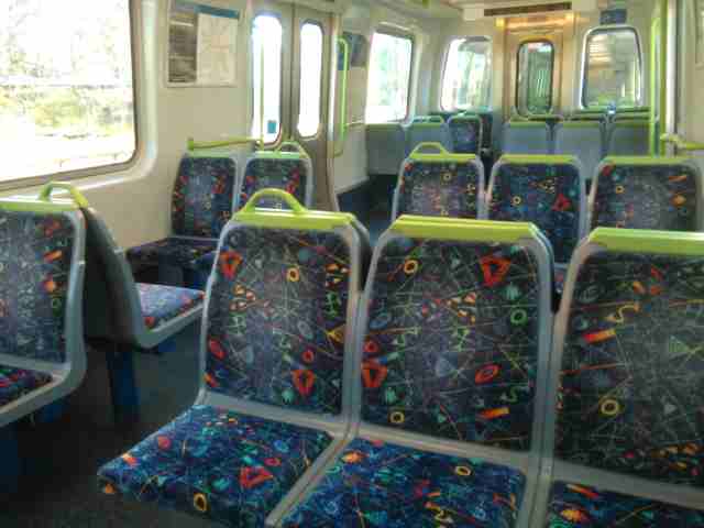 I was surprised that the train carriage still had the configuration of 3-across seats. On the Hurstbridge line (my line) they have removed the third seat so that more people can stand.