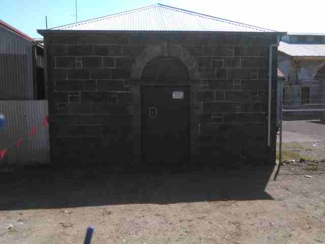 This is the bluestone morgue, now in Ann Street, moved from its original position on Gem Wharf. It was constructed in 1859, only a short time after the first morgue was fully completed in Melbourne, possibly at the Western end of Flinders Street (an earlier morgue started near Princes Bridge in Melbourne in 1853-4 was never completed). The Williamstown morgue was built using convict labour from the hulks and it was sited on the wharf where the tidal waters could wash away the…um…waste.