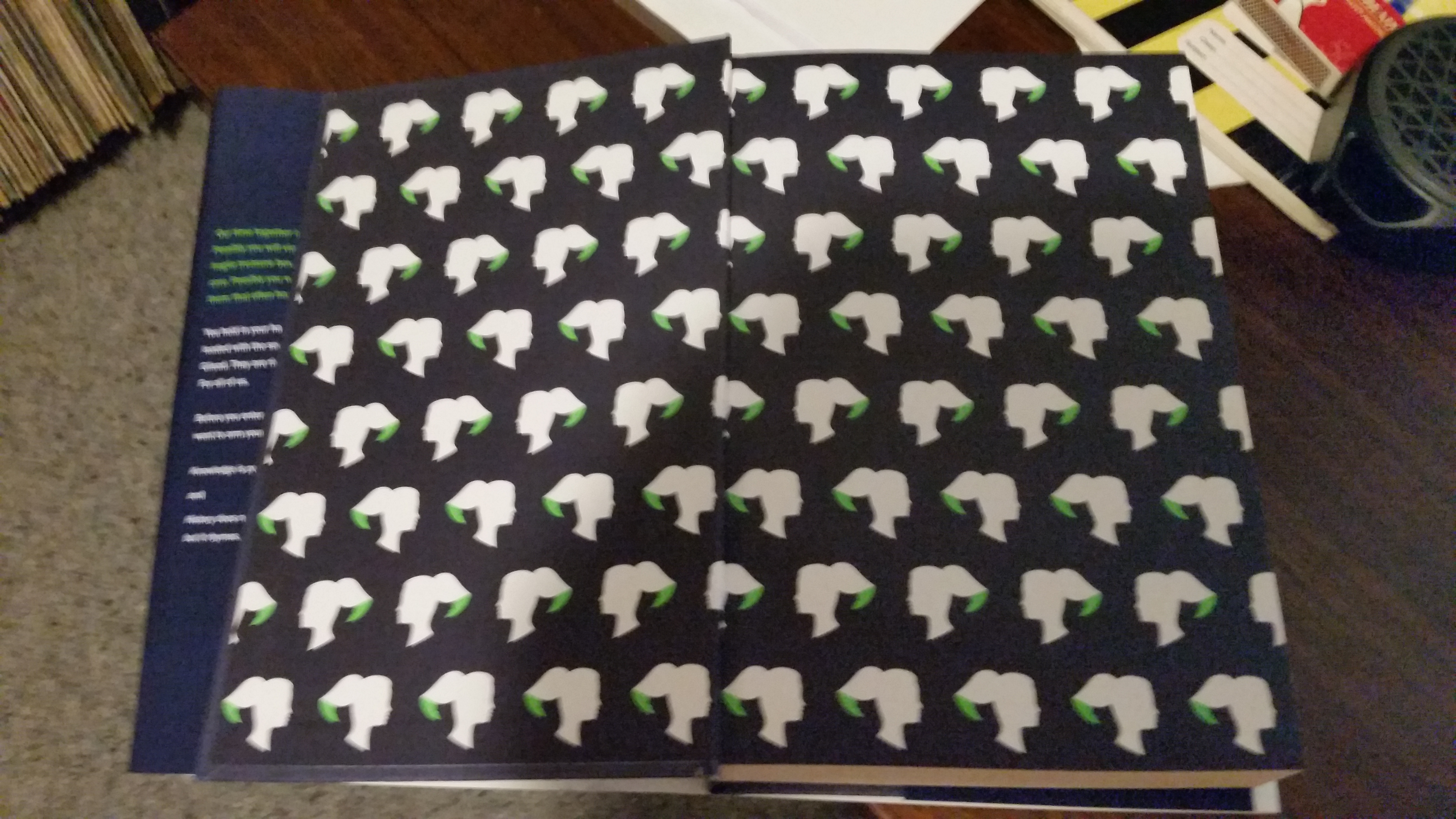 I bought the hardcover version, which is really beautiful. It has eschewed the red and white of the handmaid’s uniform for dark blue, bright green and white. The endpapers (is that the right word? the inside of the cover) are a clever visual trick that switches between handmaid and girl with a ponytail. It made me remember how much I enjoy reading a real, hard-cover, printed book.