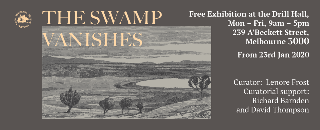 Well, true to form, I visited the current exhibition ‘The Swamp Vanishes’ at the Drill Hall in a’Beckett St, the home of the Royal Historical Society of Victoria, just days before it finishes. Extended because of the pandemic, the exhibition will close at 5.00 p.m. on Friday 5th February – so if you want to catch it, you’d better hurry.