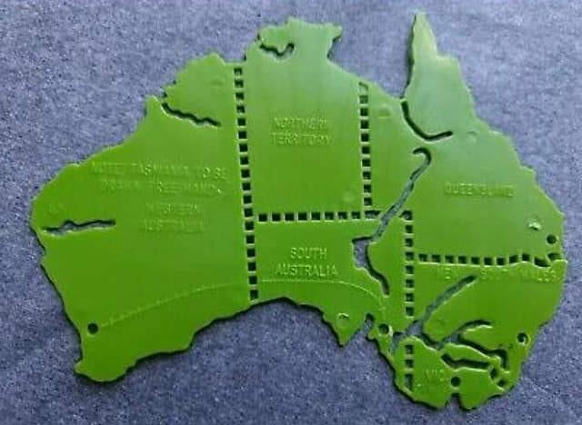 As I remember, it was in about Grade 5 that we “did” Australian history – the first taste of ‘aborigines, explorers, gold and Eureka’- and we used a plastic template to draw Australia. Poor old Tasmania didn’t even get a look-in, but I was also disconcerted by the borders of Victoria, which started with off the solid line of the Murray River before trailing off into dotted lines, like the other state boundaries. Not that the dotted lines were any use: they were impossible to fit a pencil point into, anyway, but they did give a visual sense of state borders. (And emphasized the importance of water compared to boundaries, even though that water might disappear completely from time to time).