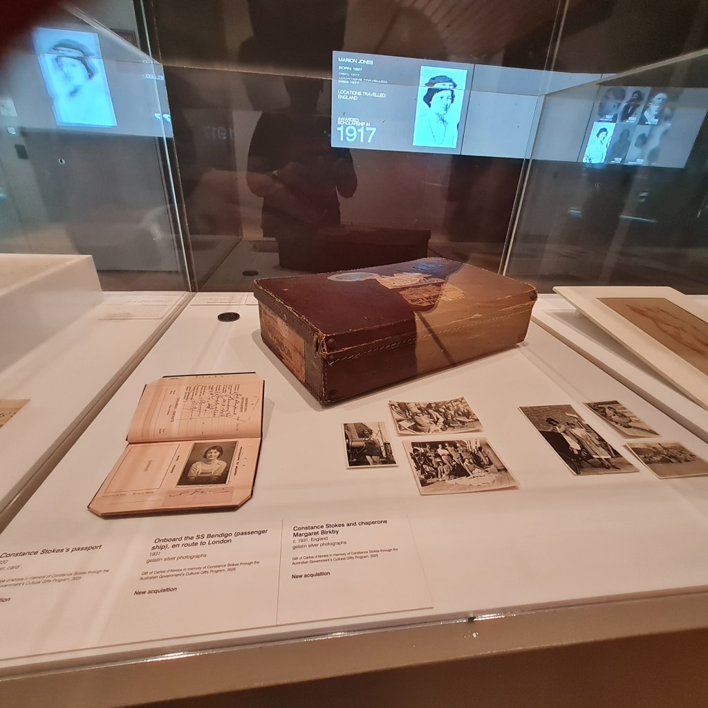 What I really intended to see was a display of the National Gallery of Victoria Travelling Scholarship. This is a tiny exhibition, tucked away on the first floor near the escalators. The NGV established its Travelling Scholarship in 1887, just 25 years after the Gallery opened. Awarded every three years, the three-year scholarship granted a stipend to study at art epicentres across Europe. Scholarship-holders were required to provide to the Gallery a replica of an Old Master painting, a nude study, and an original composition. A cheap way of increasing the size of the collection, I suppose. The exhibition is mainly just a projection on a wall, showing biographical details of several recipients (nicely balanced between male and female artists) with a few glass cases containing objects belonging to Constance Stokes (nee Parkin) trip that she received as part of her scholarship in 1929. Just a slight young girl, you get a sense of how exciting it must have been to travel over to London to study at the Royal Academy of Arts, with her passport, photographs and ball invitations.
